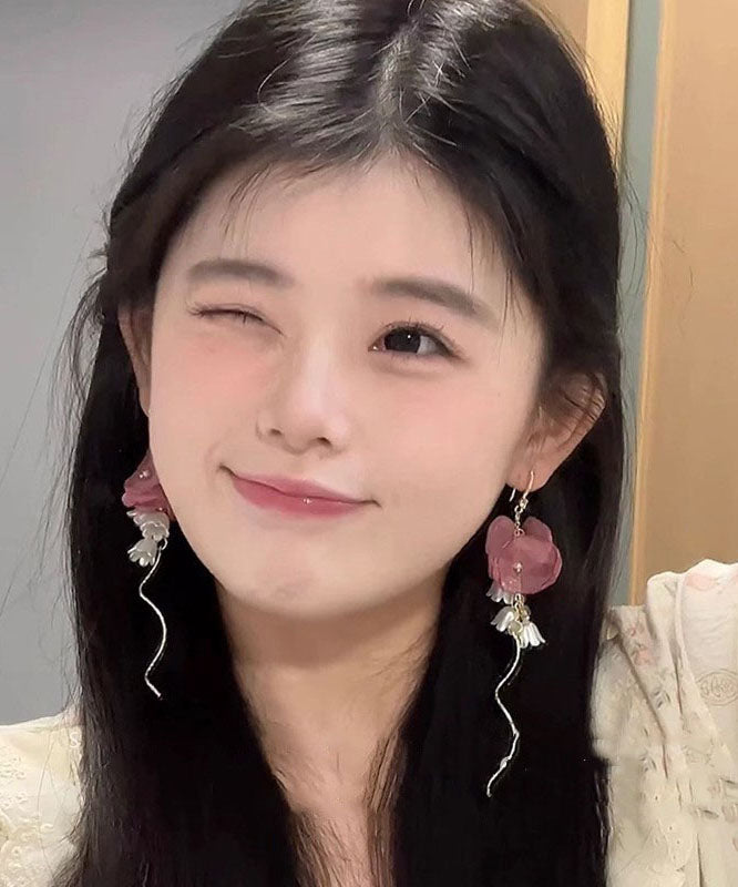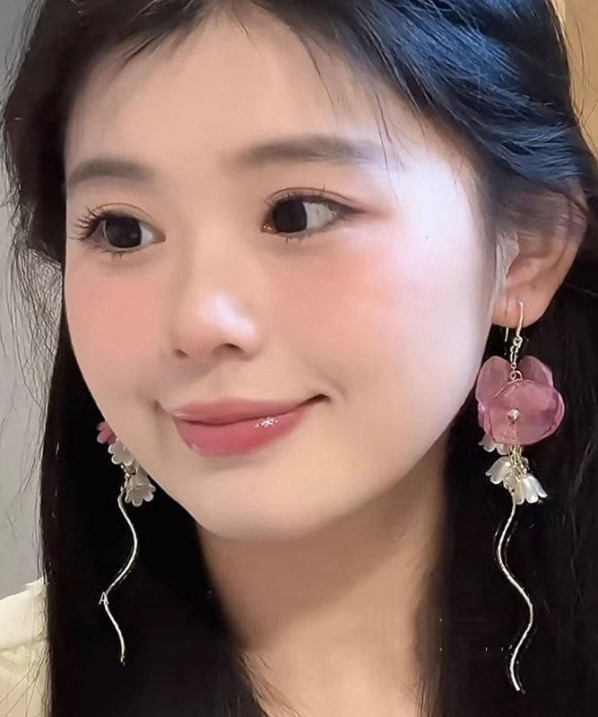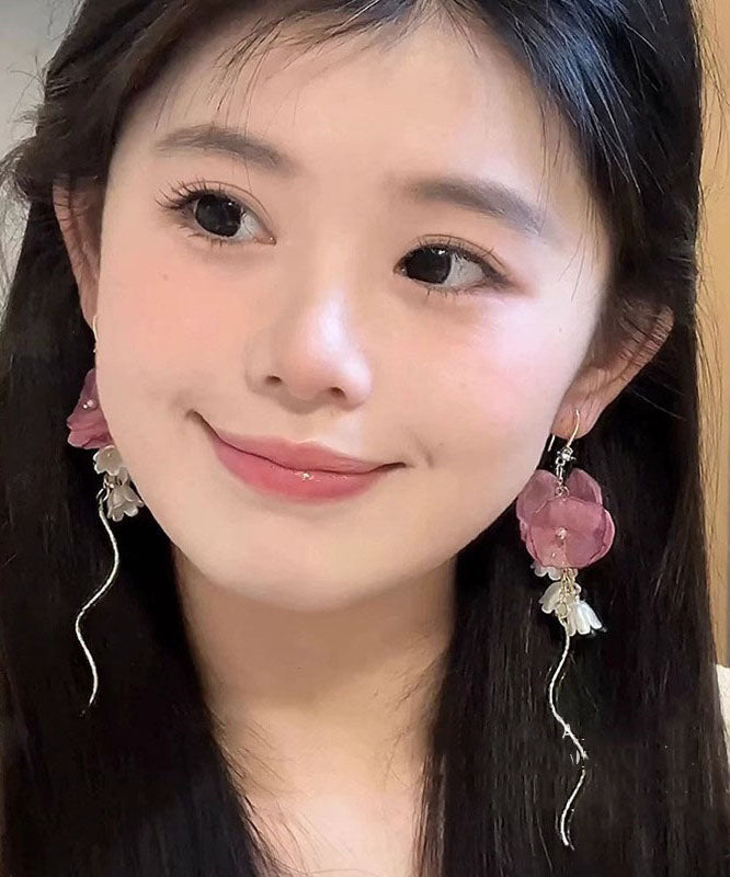 Cute Pink Crystal Pearl Tulle Floral Tassel Drop Earrings LL007