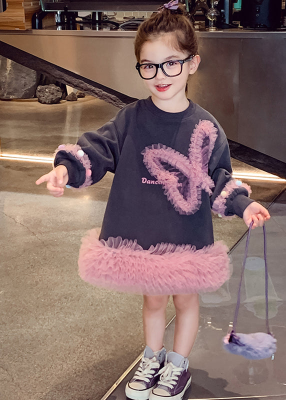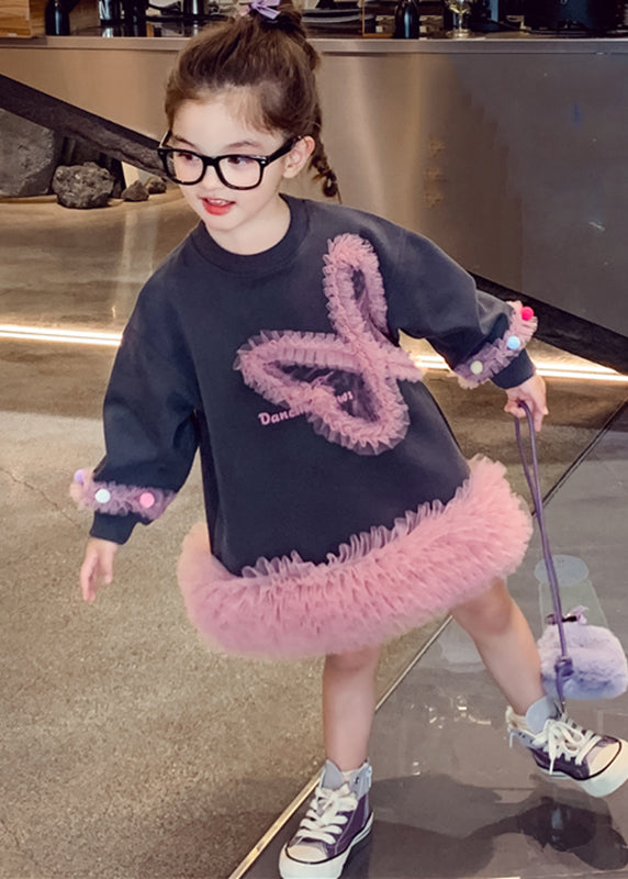 Chic Dark Grey O-Neck Print Tulle Kids Maxi Dresses Lantern Sleeve TG010