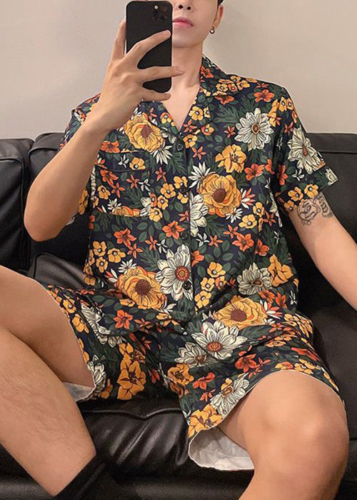 Chic Green Button Print Ice Silk Mens Pajamas Two Piece Set Clothing Summer HG048