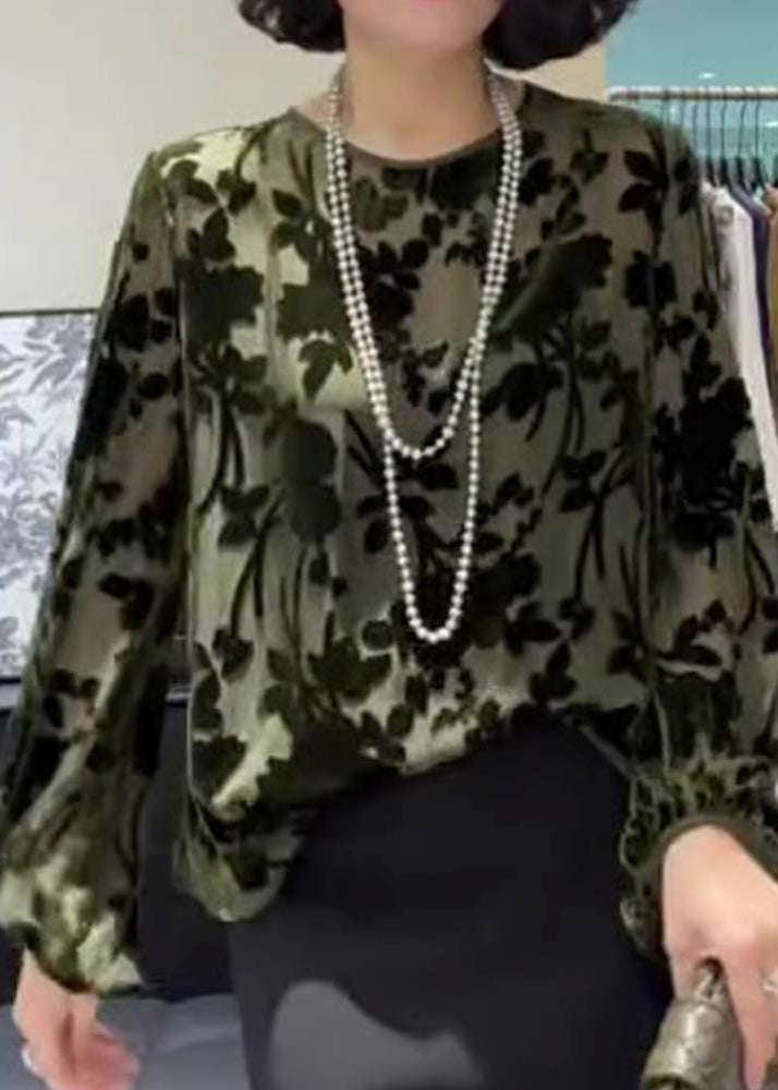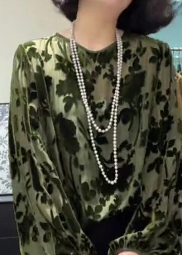 Chic Green O Neck Jacquard Silk Velour Top Fall WP040