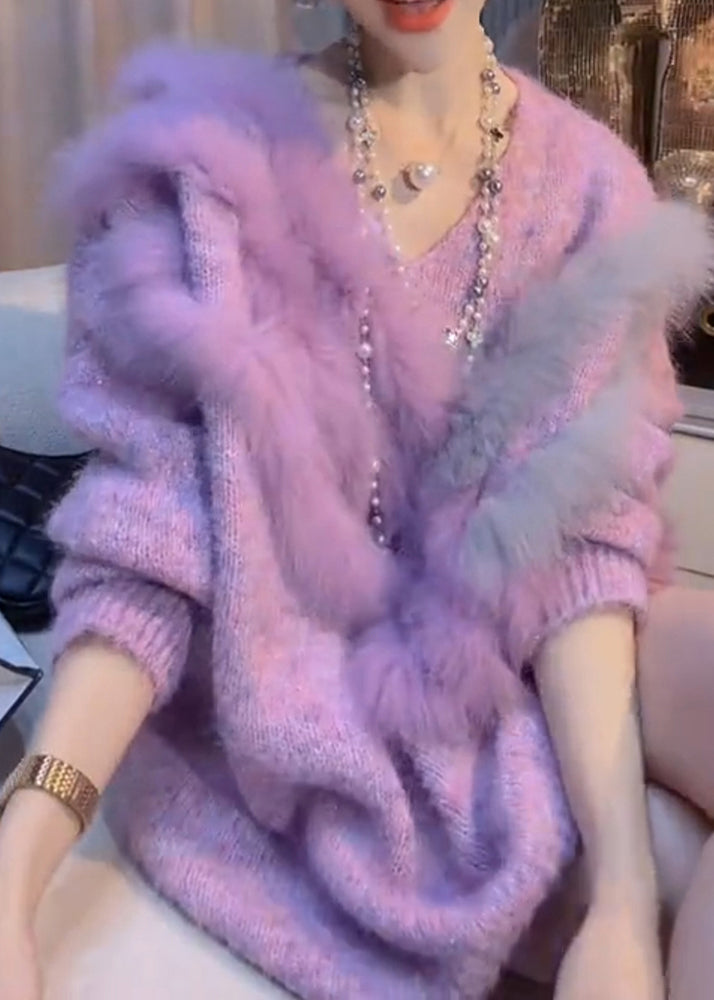 Chic Purple V Neck Patchwork Thick Cozy Cotton Knit Sweater Winter RK003