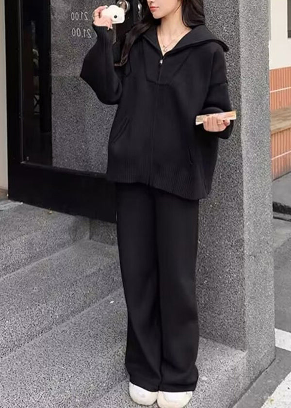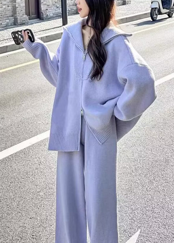 Chic Purple Zip Up Sweaters And Pants Knit Two Pieces Set Winter WV016