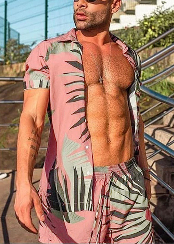 Chic Yellow Button Print Cotton Men Two Pieces Set Short Sleeve HG039
