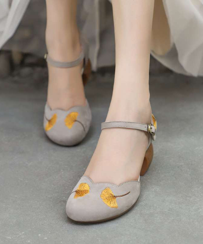 Classy Black Chunky Cowhide Leather Embossed Buckle Strap High Heels SL1022