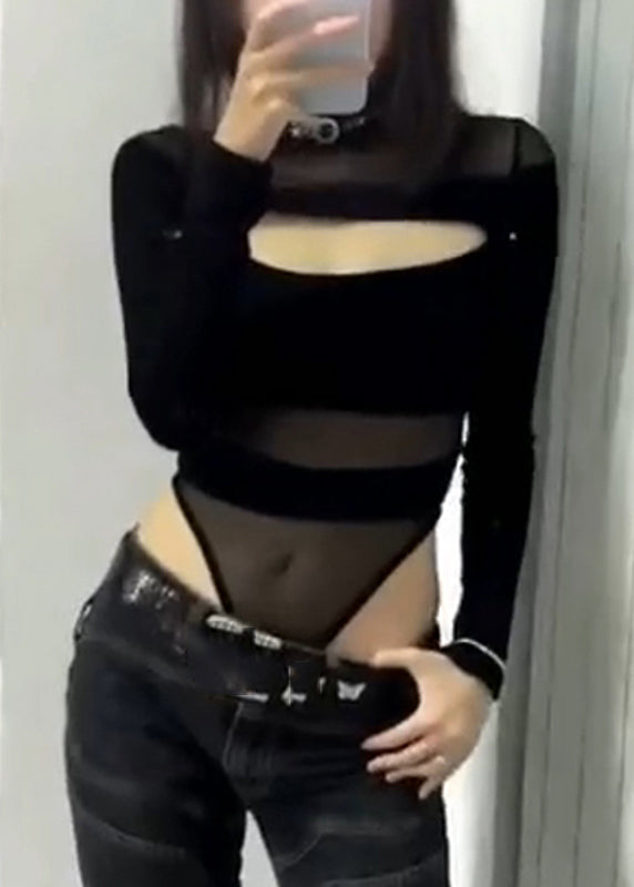 Classy Bodysuit Solid Out Tulle Hollow Black