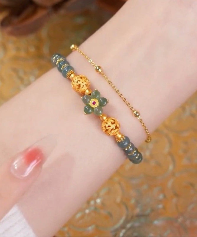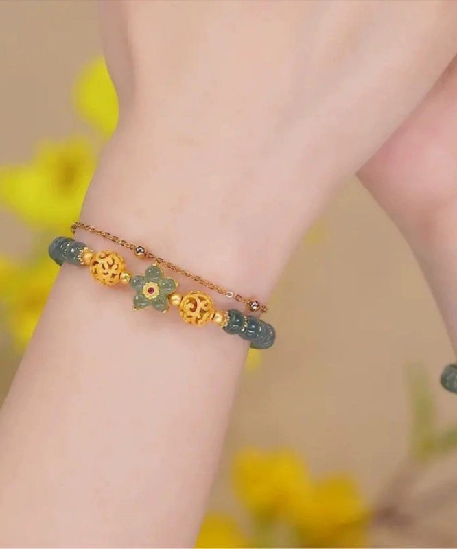Elevate your style with the exquisite elegance of our Classy Green Sterling Silver Overgild Jade Floral Tassel Charm Bracelet. This luxurious accessory features finely-crafted sterling silver and an opulent jade centerpiece, adorned with delicate floral accents and a charming tassel for a touch of sophistication. Perfect for those who appreciate the finer things in life, this bracelet will add a tasteful and exclusive touch to any outfit.