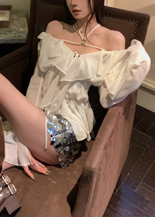 Classy White Ruffled Lace Up Chiffon Shirt Long Sleeve KK089