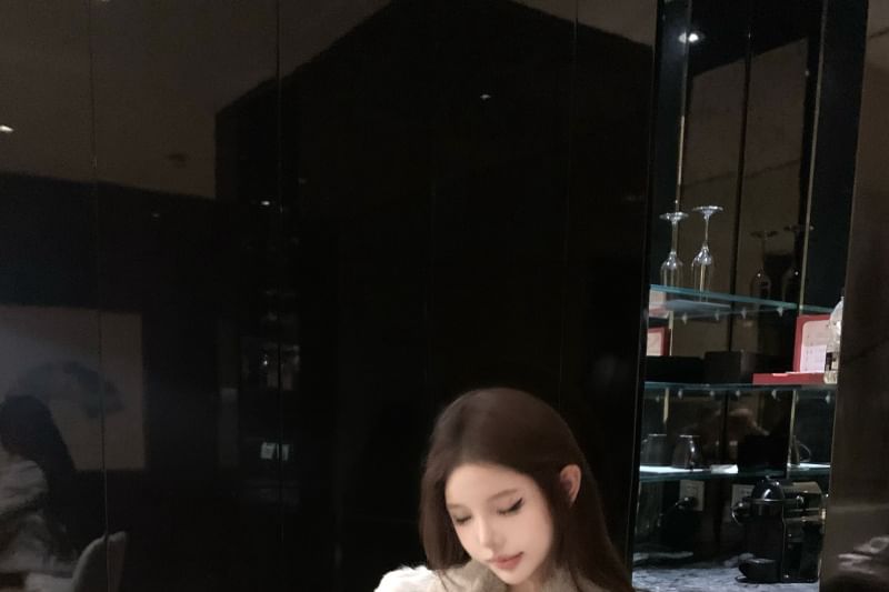 Collared Plain Faux Fur Jacket / Drawstring Waist Plain Knit Straight Leg Pants