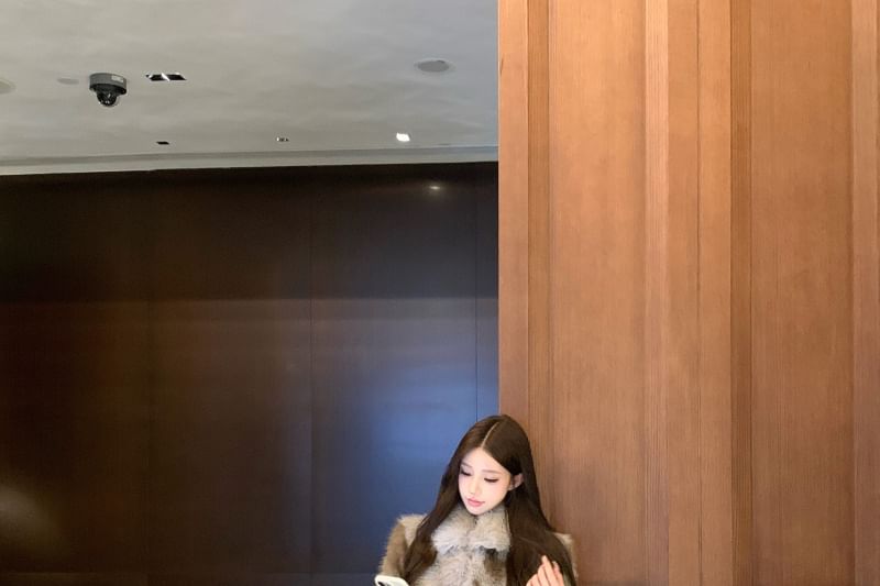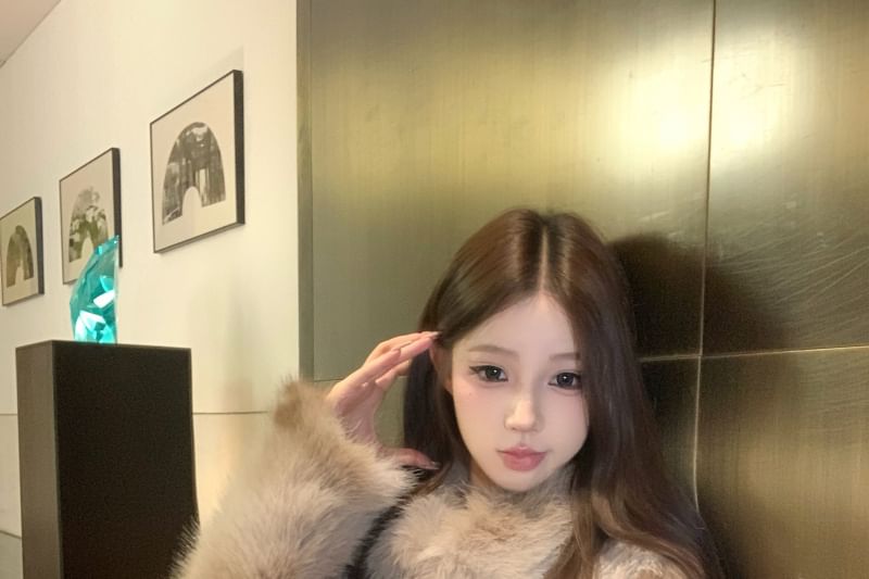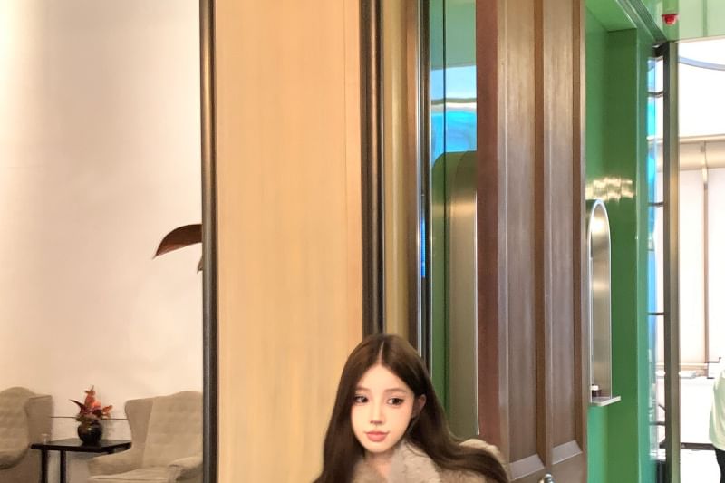 Collared Plain Fluffy Jacket / High Waist Belted Mini Pencil Skirt
