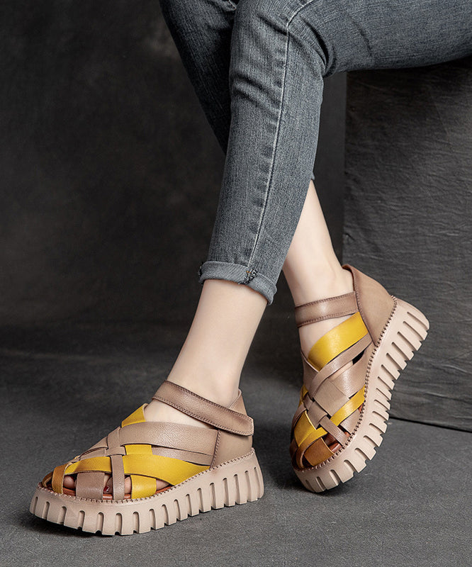 Comfy Hollow Out Splicing Platform Sandals Yellow Cowhide Leather DD1050