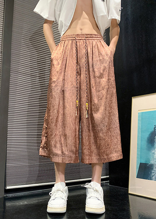 Cool Brown Chinese Button Patchwork Ice Silk Men Crop Pants Summer SA061