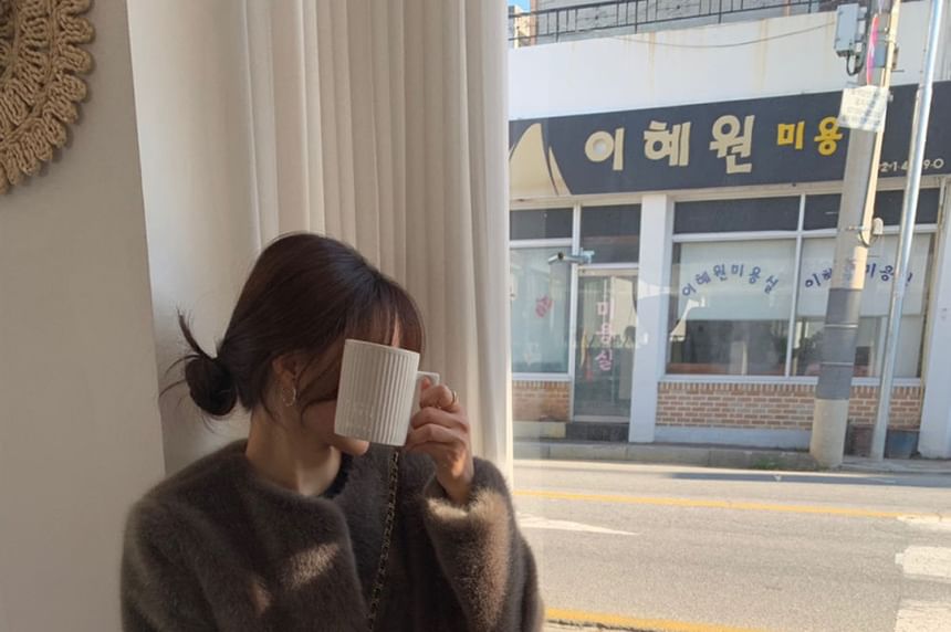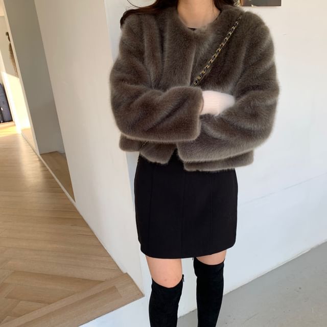 Crew Neck Plain Fluffy Open Front Crop Jacket