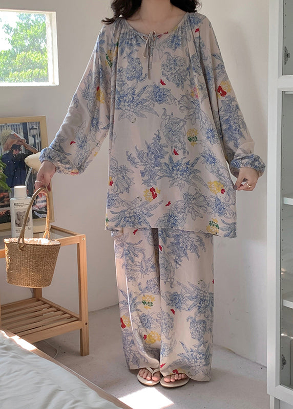 Cute Apricot O-Neck Print Silk Velvet Top And Pants Two Pieces Set Long Sleeve XS1005