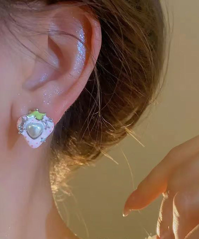 Cute Love Zircon Pearl Earrings Stud Strawberry Pink Copper