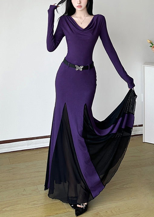 DIY Purple Turtle Neck Patchwork Cotton Party Dress Spring YP046