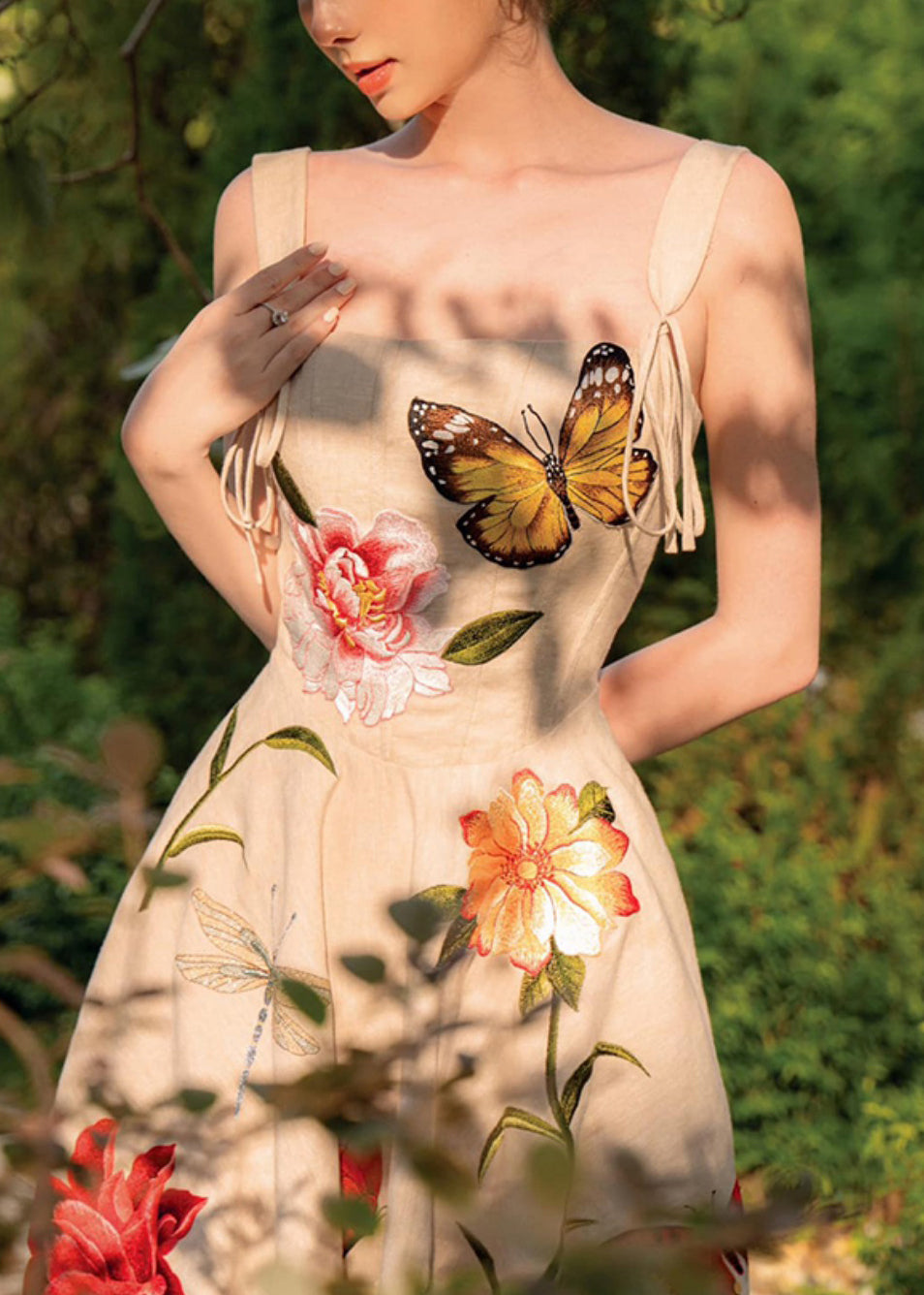 Elegant Apricot Embroidered Lace Up Cotton Dresses Sleeveless KK027