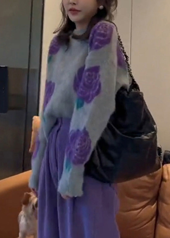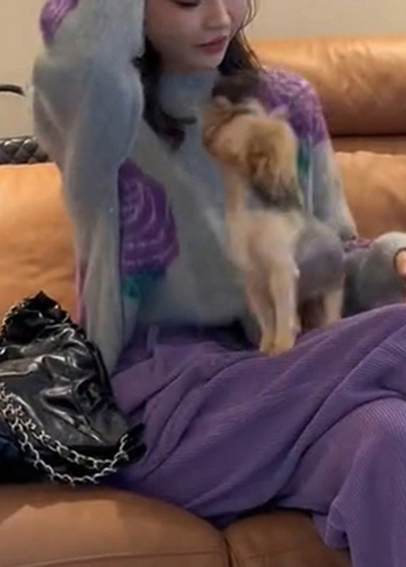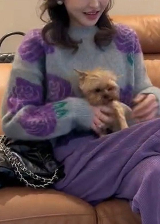 Fashion Purple Print Cotton Knit Sweater And Wide Leg Pants Two Pieces Set Winter RK013
