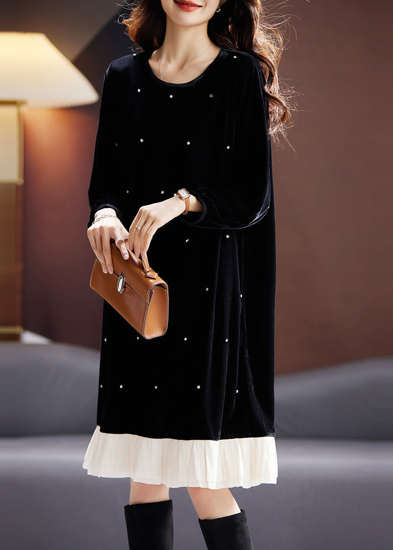 Fine Black O Neck Nail Bead Patchwork Velvet Dress Fall AC1007
