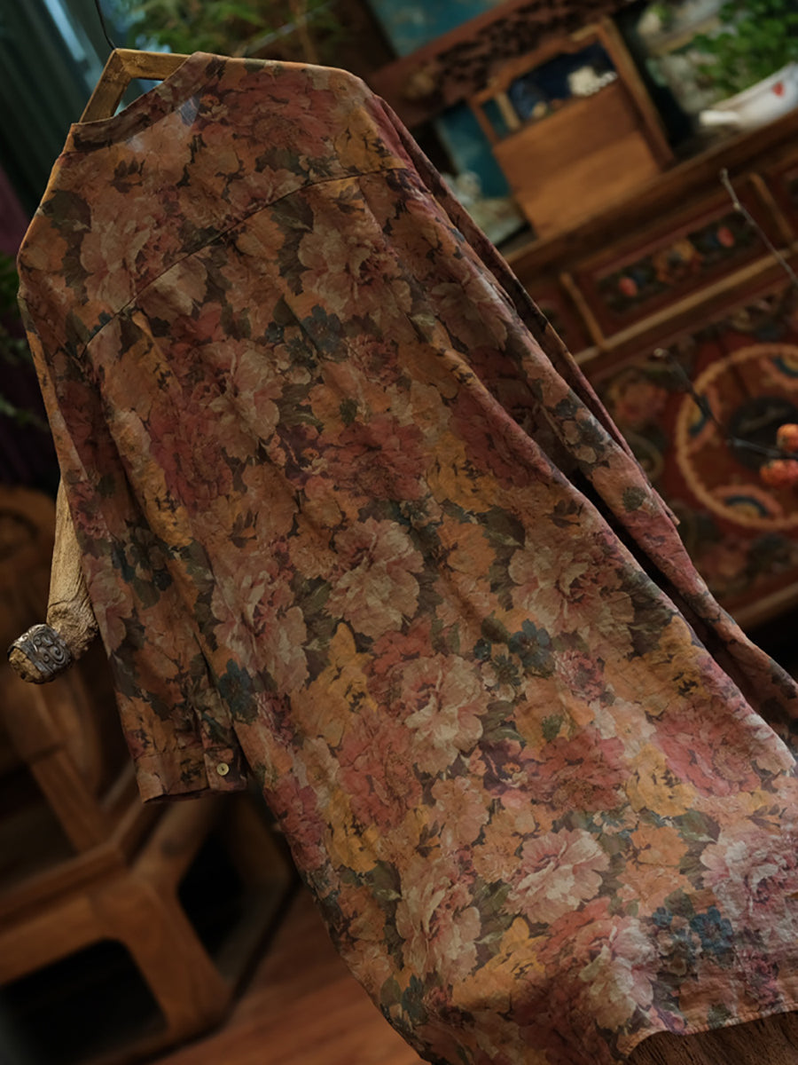 Floral Women Shirt Retro Long Vintage Ramie Button-up