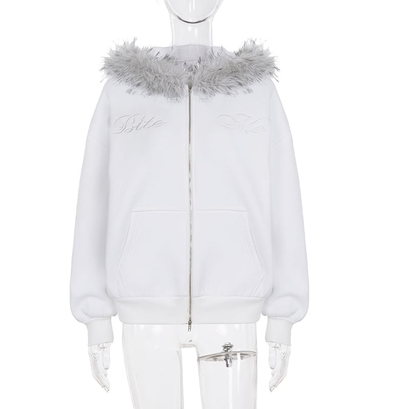 Fluffy Hooded Lettering Embroidered Zip Jacket