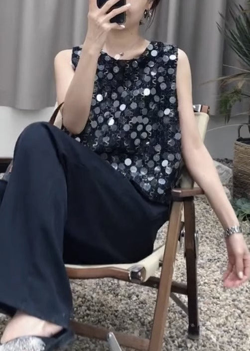French Black O Neck Sequins Patchwork Tank Sleeveless WY001