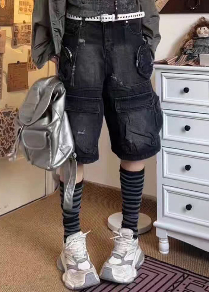 Luxurious French Black Patchwork Shorts with Pockets, perfect for a stylish summer look.
