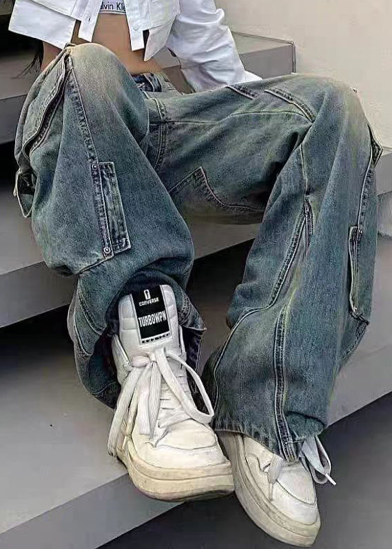 French Blue Pockets Elastic Waist Denim Pants Fall QF041