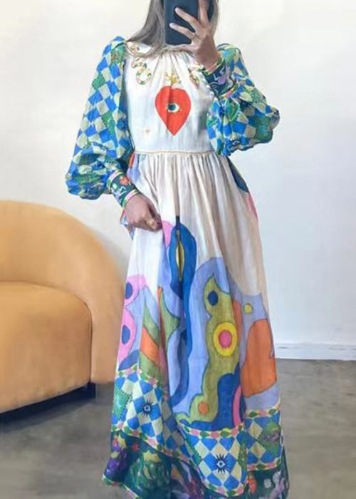 French Blue Print Lace Up Patchwork Cotton Dress Long Sleeve FF091