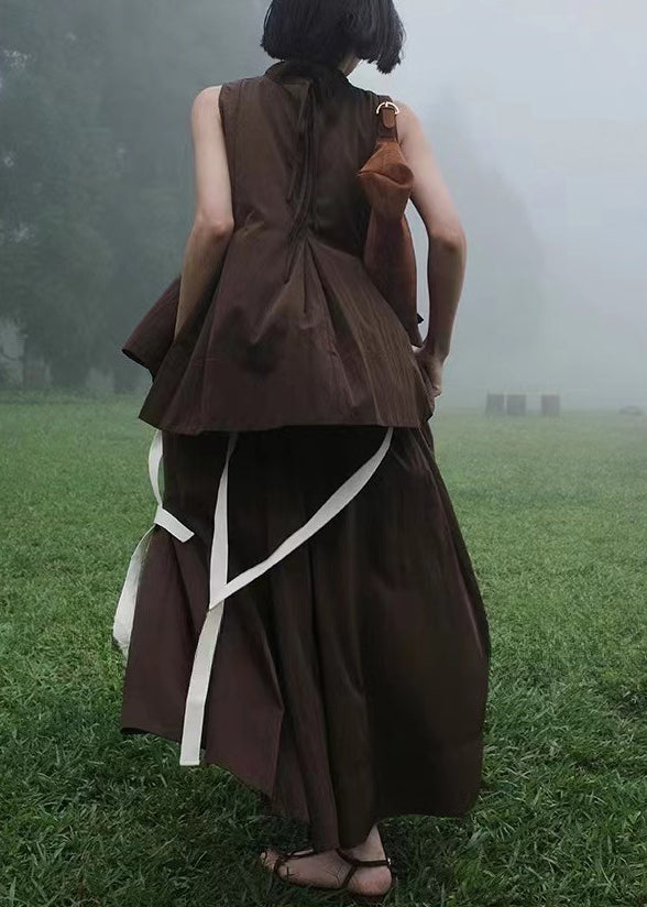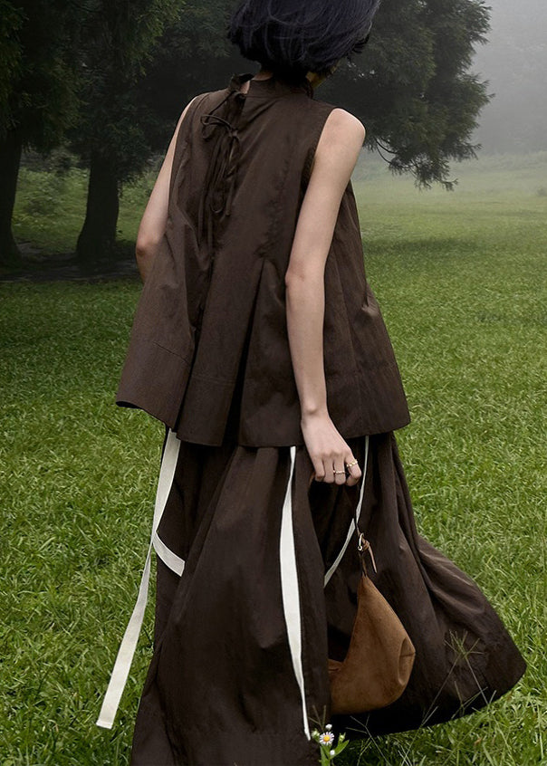 French Coffee Pockets Solid Cotton Two Pieces Set Sleeveless ZL007