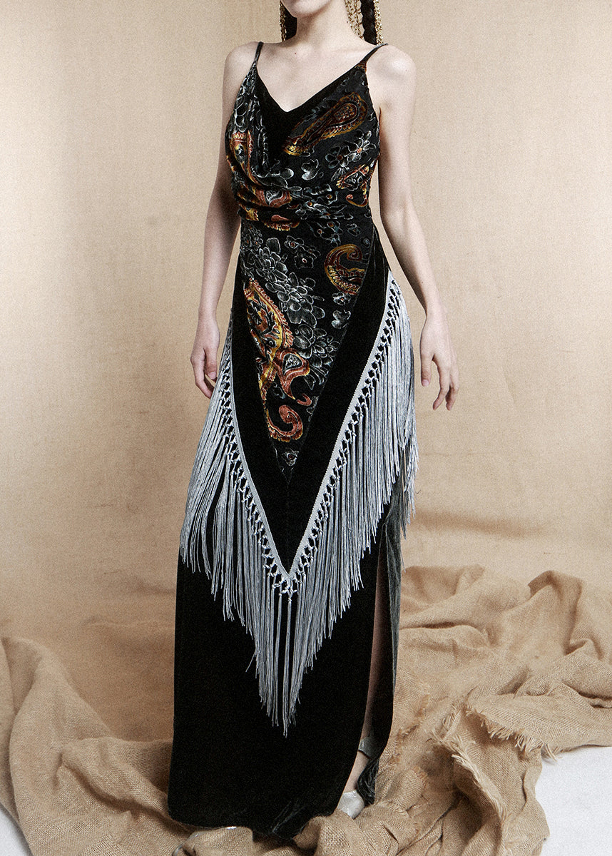 Indulge in the luxurious and exclusive feel of our French Dark Gray V Neck Tasseled Silk Velvet Spaghetti Strap Dress Sleeveless. Crafted with precision from the finest silk and velvet fabrics, this elegant dress features a sophisticated v neckline and delicate spaghetti straps adorned with tassels. The sleeveless design adds a touch of allure, making it the perfect choice for any occasion. Elevate your wardrobe with this exquisite piece that exudes art and opulence.