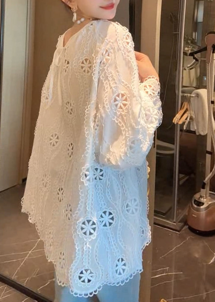 French White O Neck Hollow Out Cotton Shirt Flare Sleeve