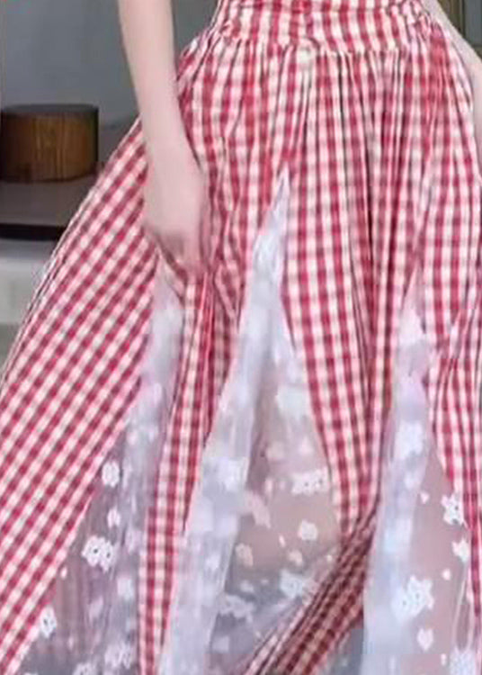 French Red Plaid Lace Patchwork Off The Shoulder Dress Summer ZL068