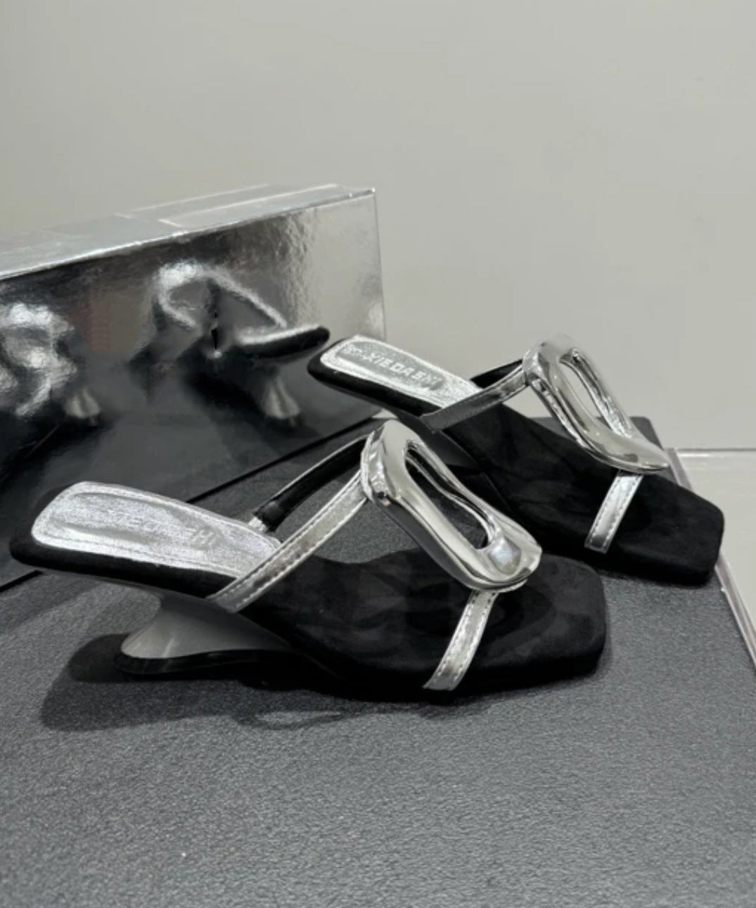 French Splicing Wedge Heels Gold Faux Leather Slide Sandals OI069