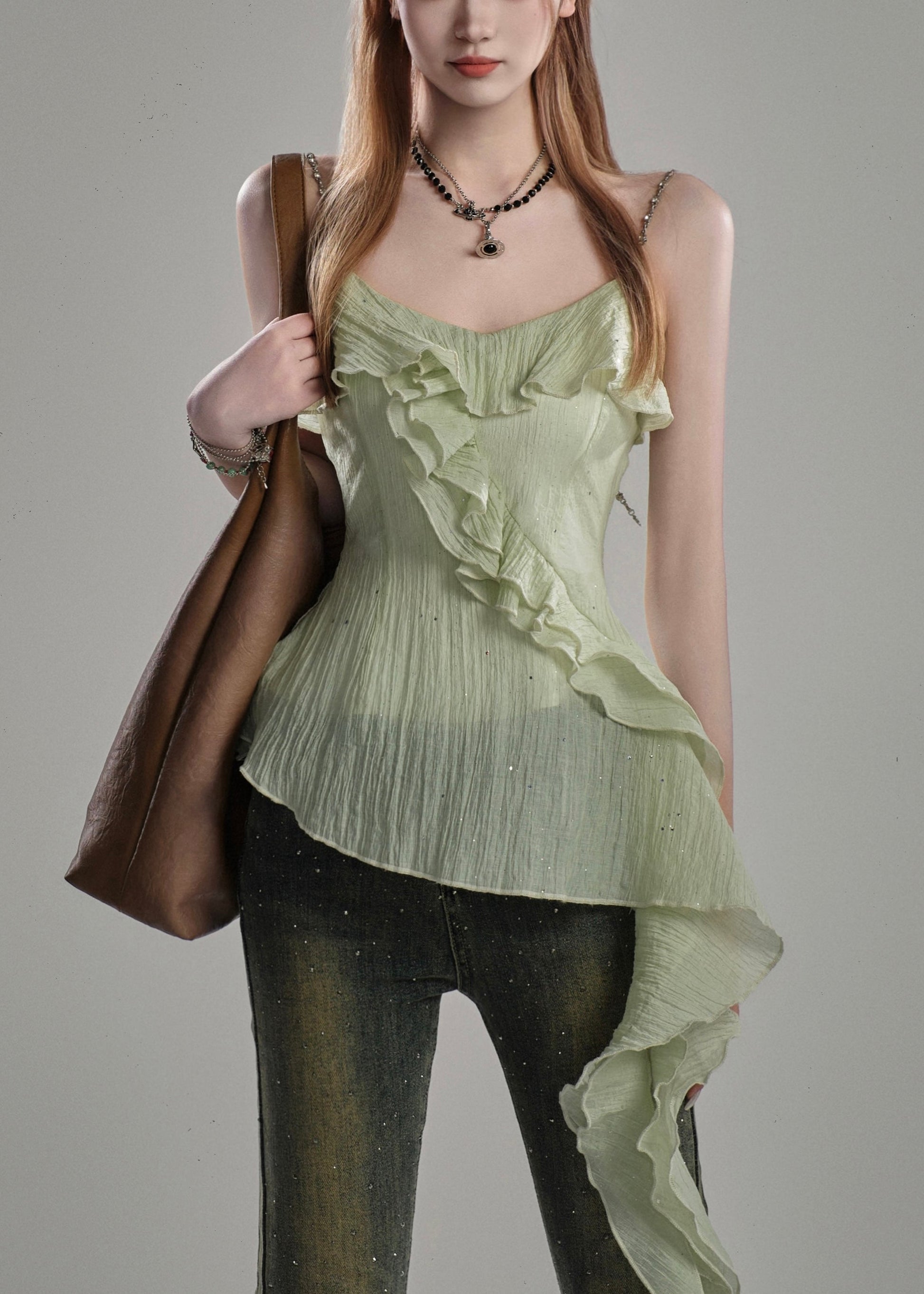 Indulge in the sophisticated elegance of our French Yellow Asymmetrical Ruffled Cotton Spaghetti Strap Tank Sleeveless, the epitome of luxury fashion.