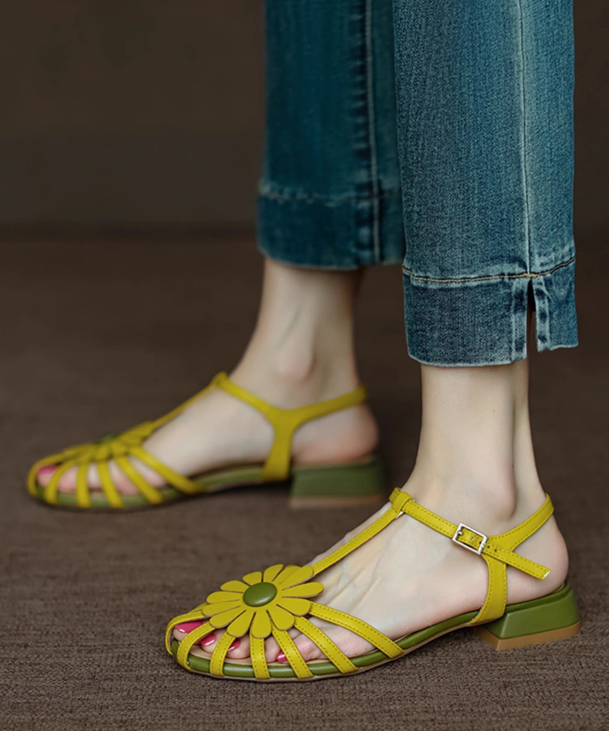 French Yellow Hollow Out Sandals Splicing Floral Chunky AA019