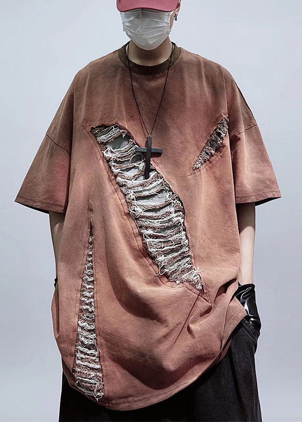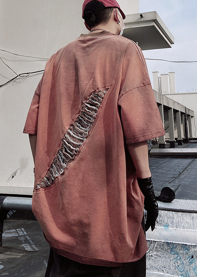 Plus Size Brick Red Oversized Cotton Ripped Mens Graphic Tees Summer