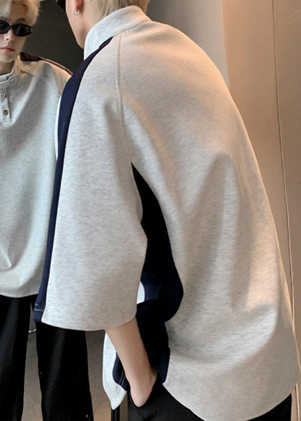 Cool Grey Stand Collar Patchwork Cotton Mens Graphic Tees Summer