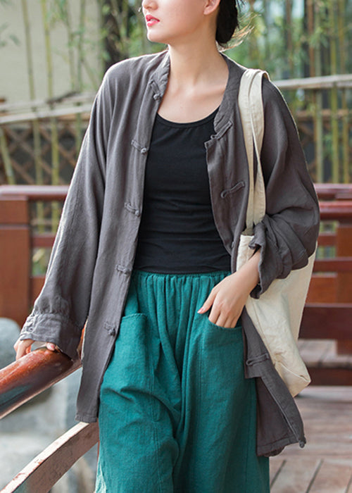 Grey Pockets Solid Linen Coats Stand Collar Fall QE036