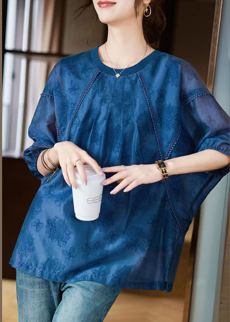 Expertly crafted with a beautiful blue O-neck and butterfly print design, this top features a unique bracelet sleeve. Handmade with precision, it is sure to become a staple in your wardrobe.
