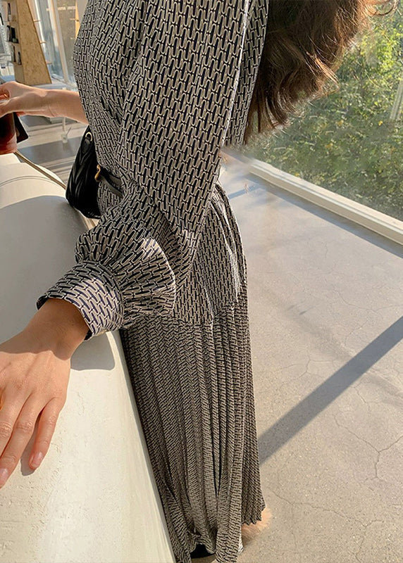 Italian Navy O-Neck Print High Waist Cotton Long Dresses Fall
