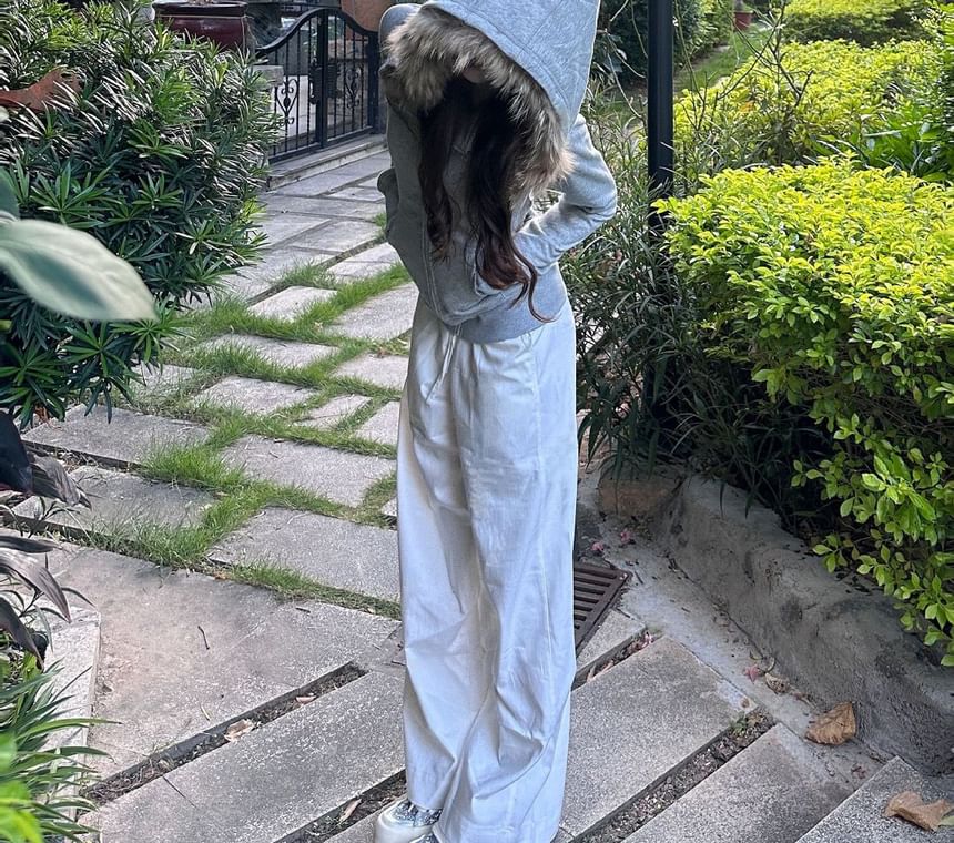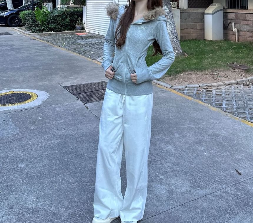 Long Sleeve Plain Faux Fur Trim Zip-Up Jacket