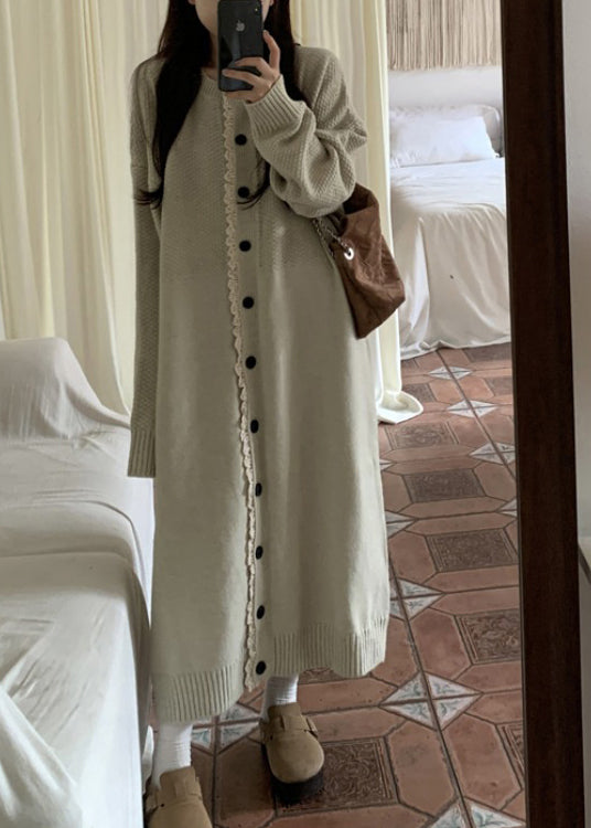 Loose Apricot O Neck Lace Button Patchwork Knit Dress Spring YY016
