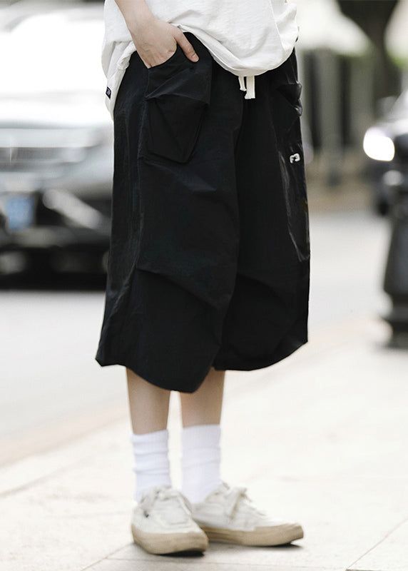 Loose Black Drawstring Pockets Patchwork Mens Crop Pants Summer YT014