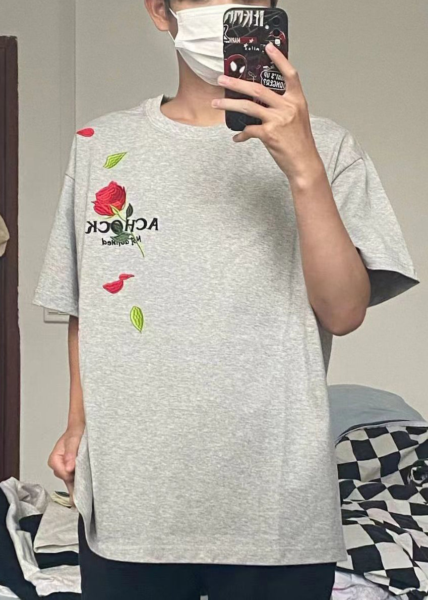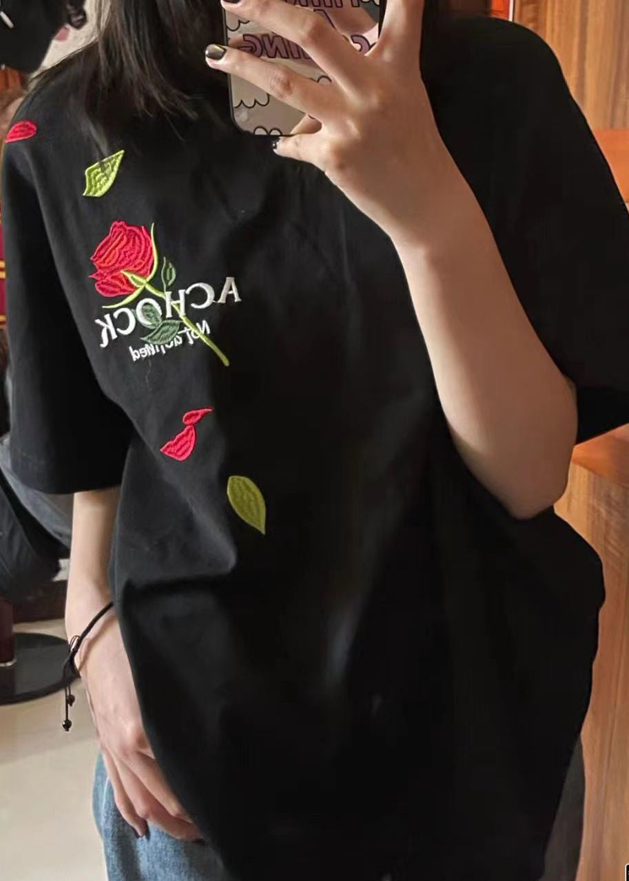 Loose Black O-Neck Embroideried Solid Cotton Mens T Shirts Short Sleeve LK046