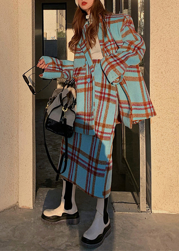 Loose Blue Peter Pan Collar Plaid Woolen 2 Piece Outfit Winter RL004