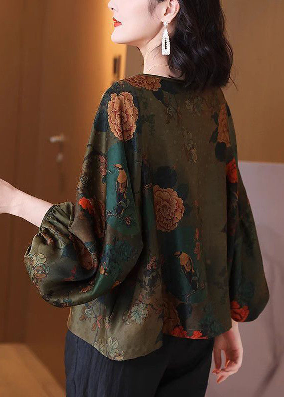 Loose Green O-Neck Print Silk Shirt Bracelet Sleeve QV054