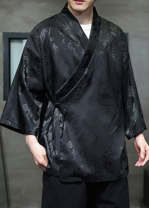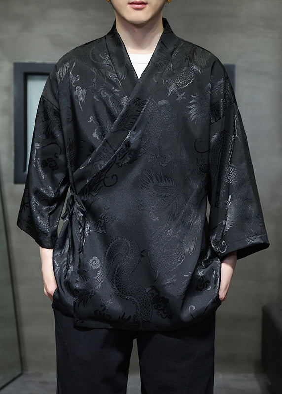 Loose White V Neck Print Lace Up Ice Silk Men Shirts Bracelet Sleeve HG003