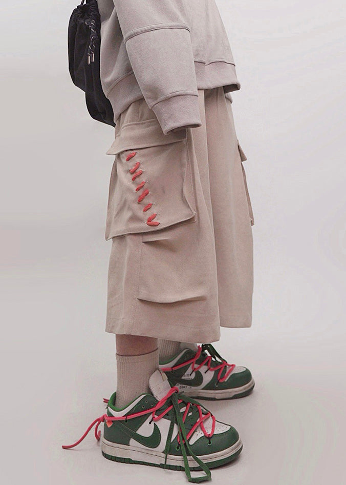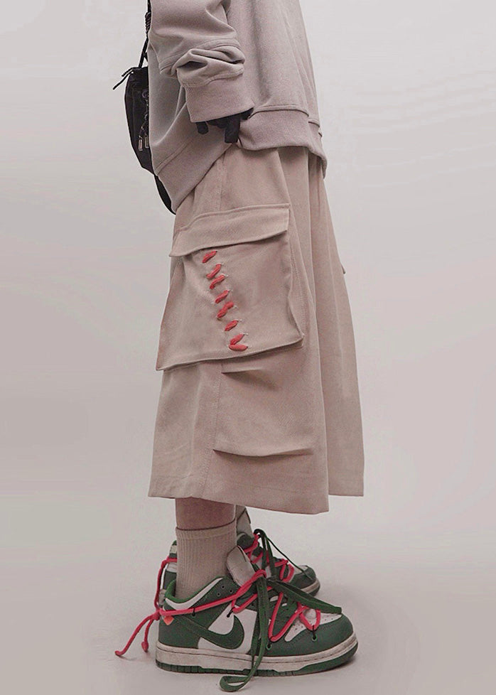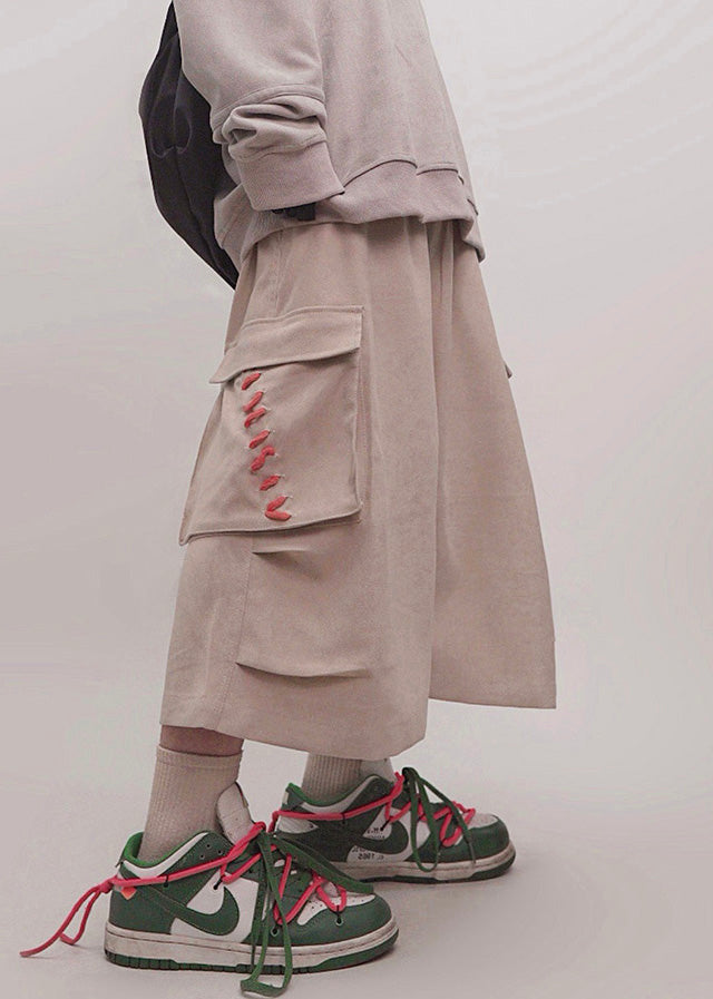 Plus Size Khaki Pockets Elastic Waist Cotton Men Crop Pants Summer