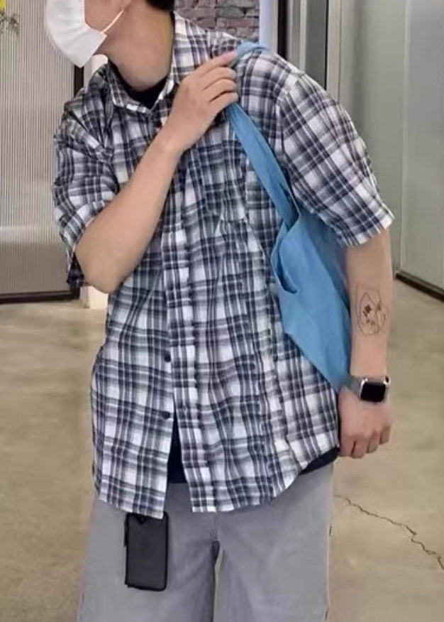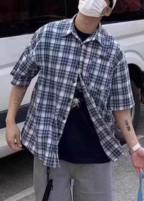 Loose Blue Plaid Button Cotton Men's Shirts Summer