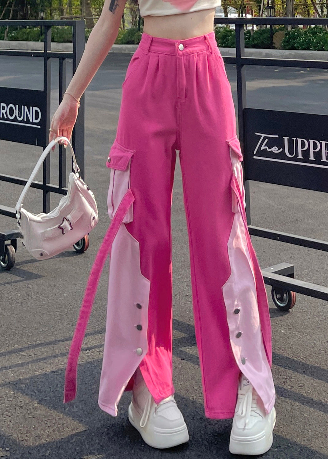 Modern Pink Pockets Patchwork Side Open Denim Pants Fall RI002